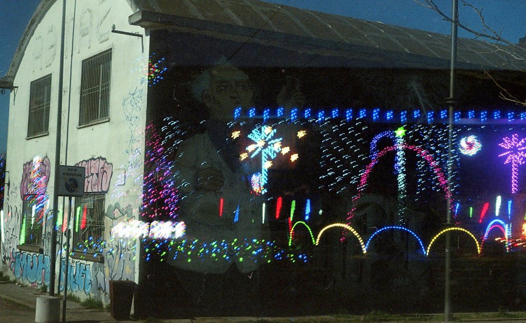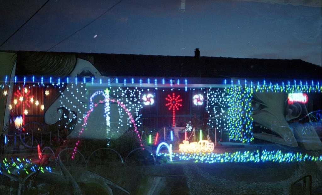 Carnival lights dance in the warm, festive night.